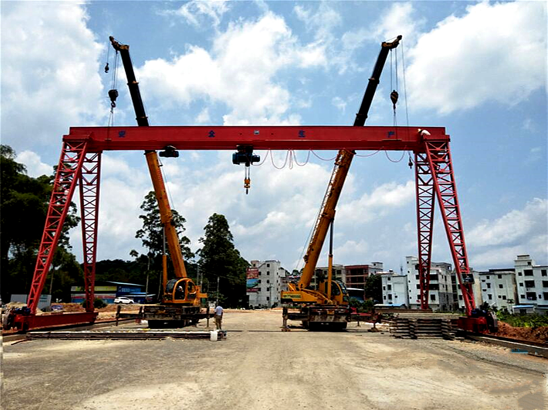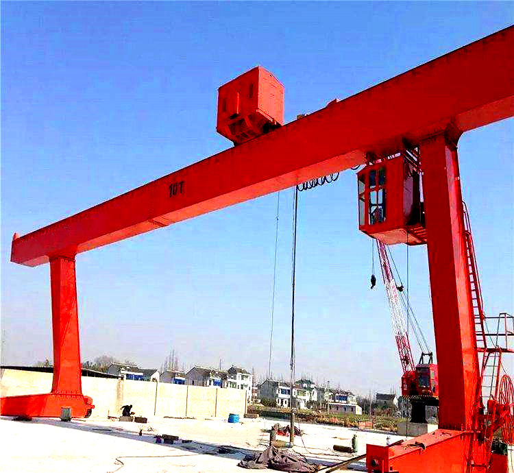 門(mén)式起重機(jī)(又稱龍門(mén)起重機(jī))是橋架通過(guò)兩側(cè)支腿支撐在地面軌道上的橋架型起重機(jī)。在結(jié)構(gòu)上由門(mén)架、大車運(yùn)行機(jī)構(gòu)、起重小車和電氣部分等組成。有的門(mén)式起重機(jī)只在一側(cè)有支腿,另一側(cè)支撐在廠房或棧橋上運(yùn)行,稱作半門(mén)式起重機(jī)。門(mén)式起重機(jī)的門(mén)架上部橋架(含主梁和端梁)、支腿、下橫梁等部分構(gòu)成。
